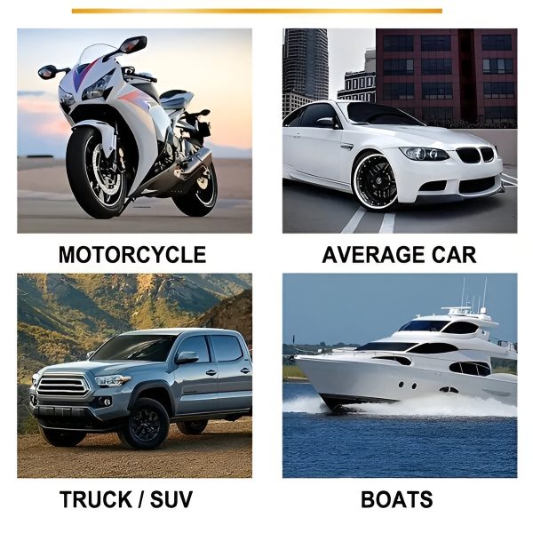 Utilize CARCOAT em automóveis, barcos, motociclos, veículos de recreio, ATVs e muito mais. É seguro para todas as superfícies, incluindo pintura, plástico e vidro.