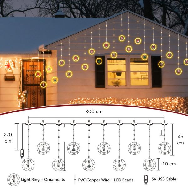 Luzes cintilantes, cuidadosamente colocadas dentro de anéis transparentes, geram uma atmosfera encantadora enquanto lançam um brilho radiante sobre as figuras suspensas.