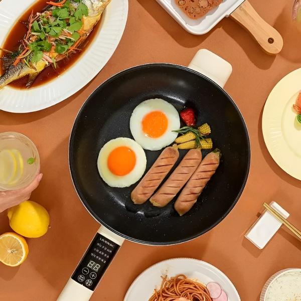 Esta frigideira elétrica permite-lhe preparar refeições completas sem precisar de um fogão, sendo ideal para qualquer espaço.