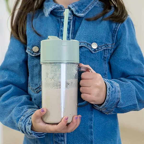 A garrafa de 420ml com tampa segura permite que misture e beba do mesmo recipiente, economizando tempo e reduzindo a necessidade de louça extra. O seu design à prova de vazamentos garante que não haja derramamentos, mesmo quando transportado numa bolsa.