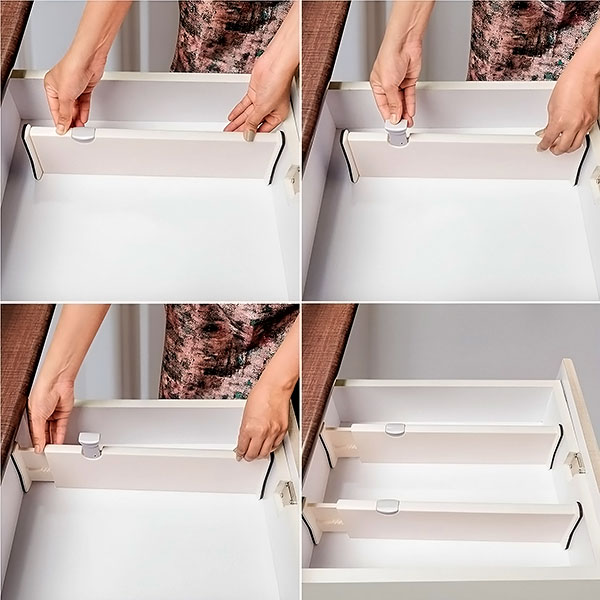 Em apenas alguns segundos, você pode transformar suas gavetas desorganizadas. Com a instalação simples de “deslizar e clicar”, organizar nunca foi tão fácil. Basta posicionar, ajustar e travar o divisor no lugar – sem ferramentas ou cola.